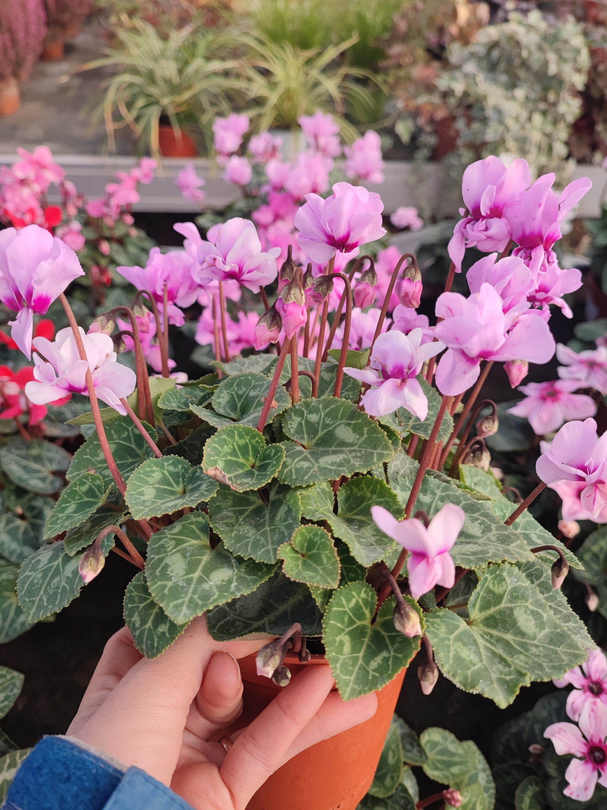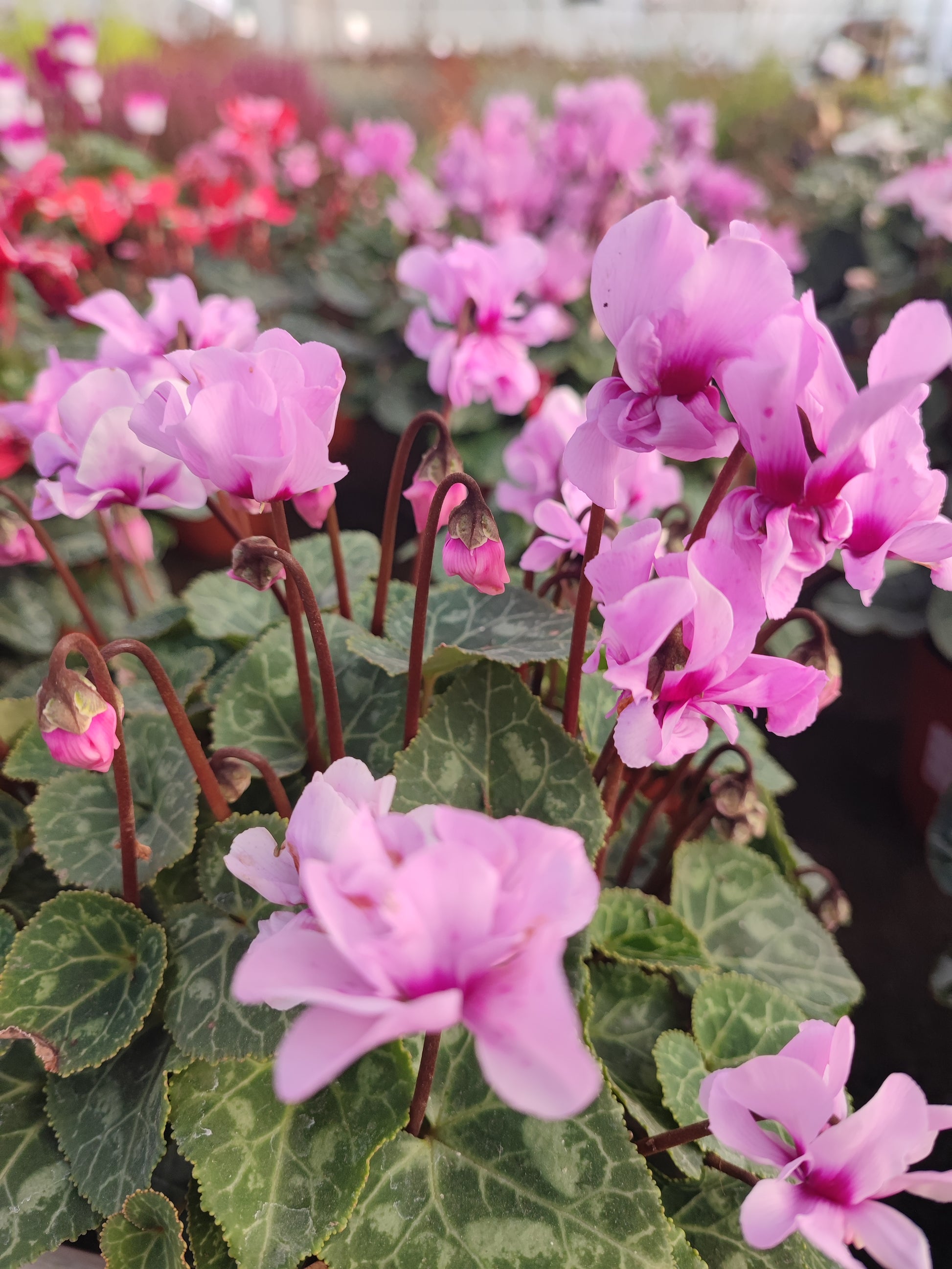 Il ciclamino è una pianta erbacea perenne che nasce da un bulbo. È molto apprezzata come pianta ornamentale grazie ai suoi fiori eleganti e colorati e al fogliame decorativo. Le foglie sono cuoriformi, spesso variegate con disegni argentati o marmorizzati. I fiori, con petali rivolti all’indietro come piccole farfalle, compaiono in diverse tonalità: bianco, rosa, rosso, viola, talvolta screziati o frangiati. La fioritura dipende dalla specie: il ciclamino comune da vaso (Cyclamen persicum) fiorisce dall’autunno fino alla primavera, portando colore nei mesi freddi. È una pianta che predilige luce diffusa e temperature fresche, tra i 5 e i 18 °C. Non sopporta il caldo eccessivo, mentre tollera bene il clima invernale se non troppo rigido. Richiede un terreno soffice e ben drenato e annaffiature regolari durante la fioritura, evitando ristagni d’acqua. Dopo il ciclo vegetativo entra in riposo estivo: le foglie ingialliscono e il tubero resta quiescente fino al ritorno dell’autunno. Il ciclamino è simbolo di tenerezza, amore sincero e rinascita ed è una delle piante da fiore più diffuse in inverno nelle case e nei giardini. La varietà petit mouline è a fiore doppio