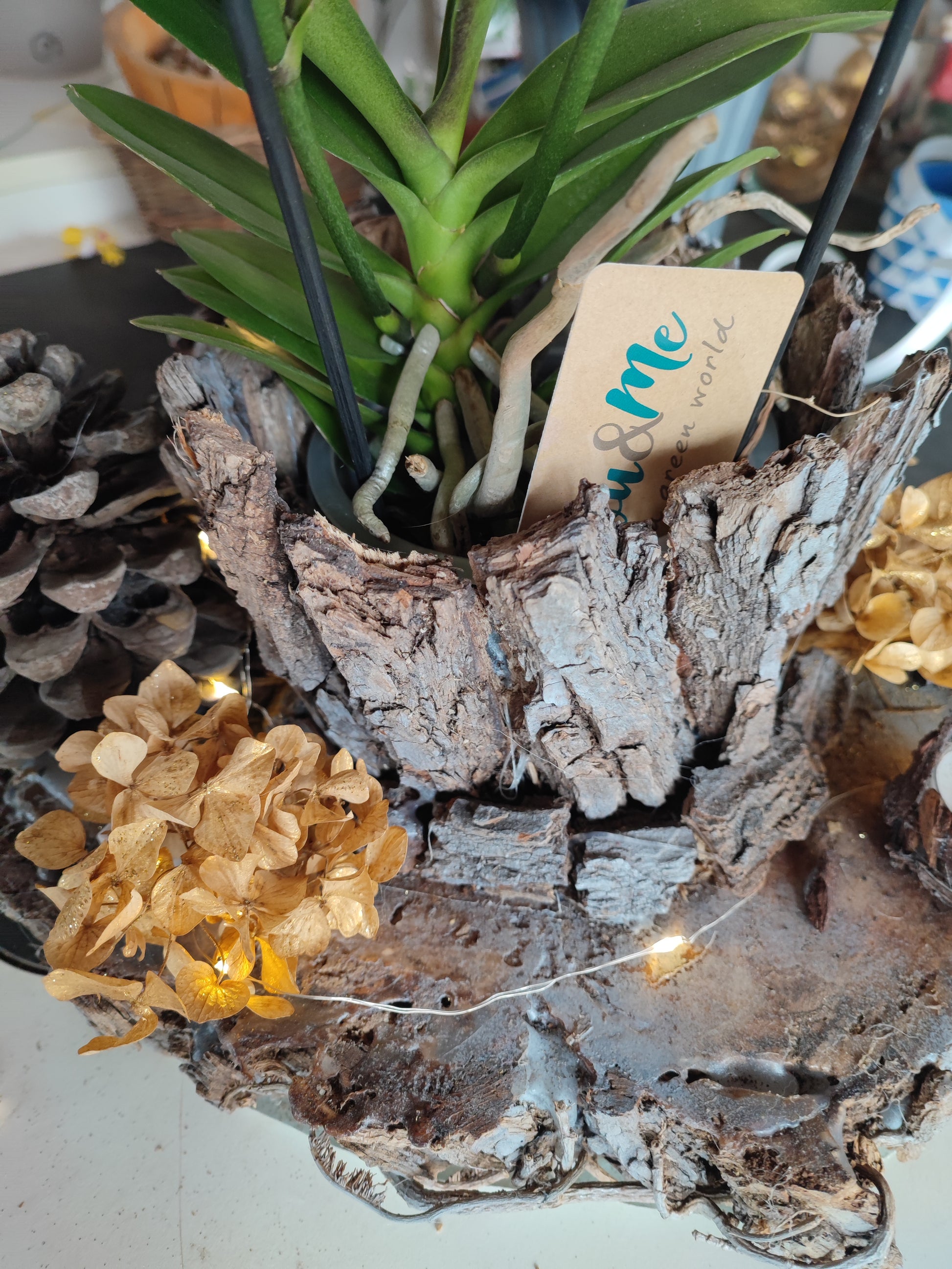 Composizione natalizia in corteccia, realizzata a mano, con orchidea in vaso 9 cm, luci, candele, fiori e pigne.
