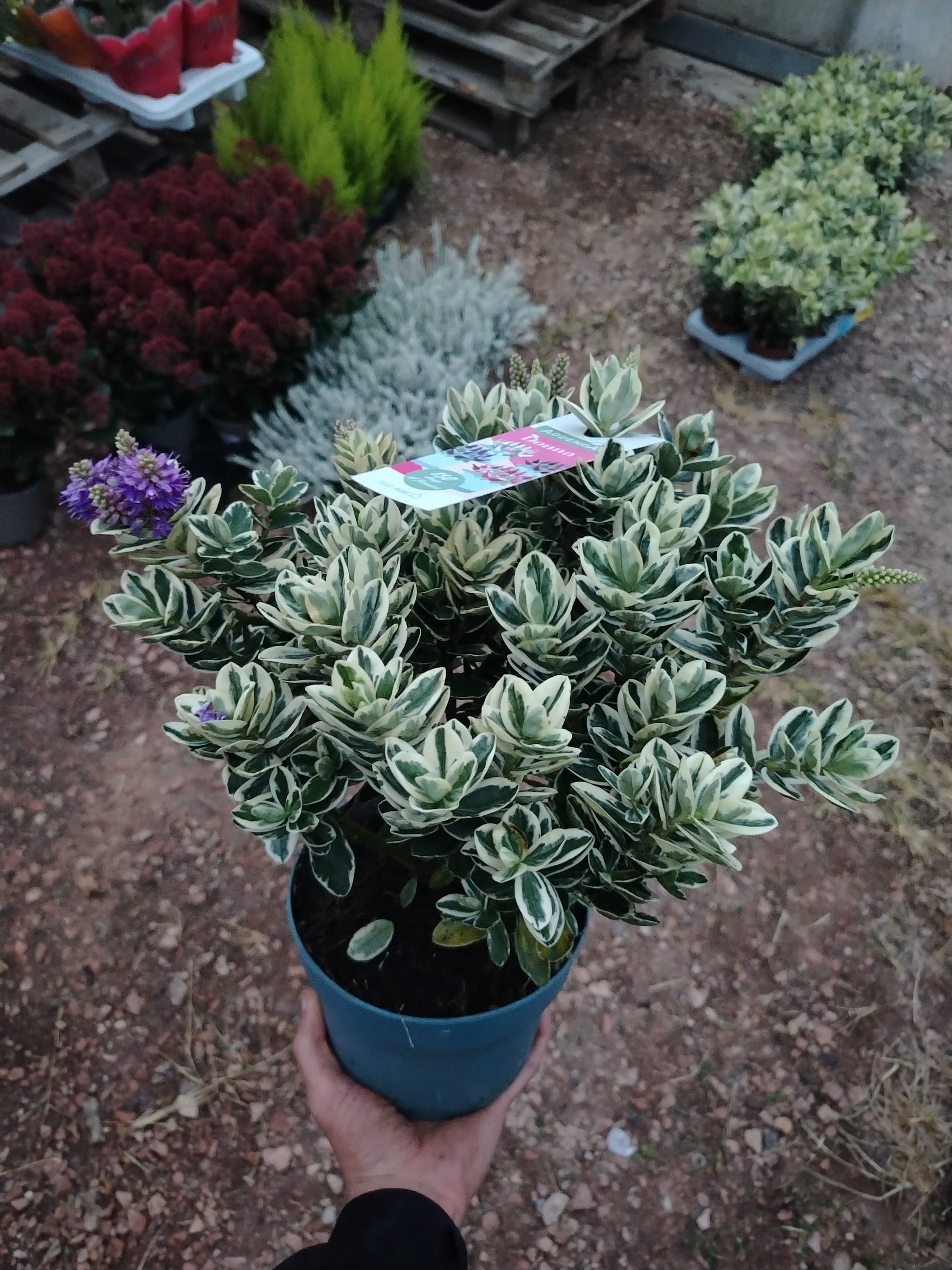 Arbusto sempreverde compatto e decorativo, con foglie variegate verde-grigio bordate di crema e graziosi fiori lilla che sbocciano in estate. Ideale per bordure, aiuole o vasi su terrazzi e balconi.