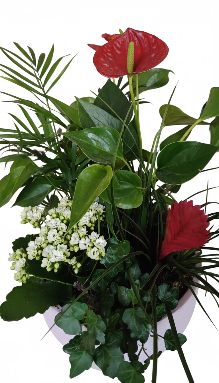 Ciotola in ceramica con piante miste: anthurium, tillandsia, edera, chamaedorea e kalanchoe